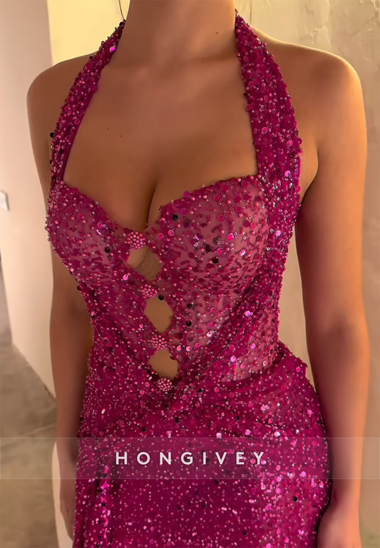 Trumpet Tie Back Sequined High Slit V-Neck Floor-Length Halter Prom Dresses