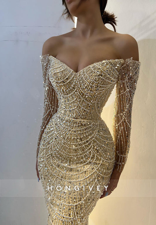 L2956 - Beaded Off-Shoulder Long Sleeves Trumpet Party Prom Evening Dress