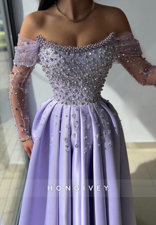 L2042 - Sexy Satin A-Line Off-Shoulder Long Sleeve Empire Beaded With Side Slit Party Prom Evening Dress