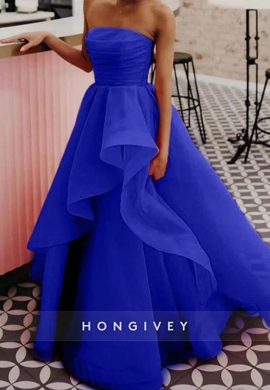 A-Line Strapless Asymmetrical Tulle Floor-Length Long Prom Dresses