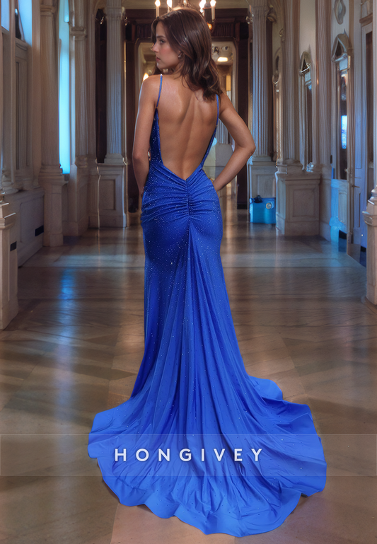 Glitter Royal Blue Spaghetti Straps Sheath with Slit Formal Evening Dress