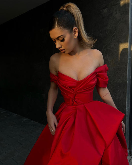 Simple Satin A-Line Off-Shoulder Empire With Side Slit Long Prom Dress