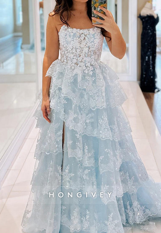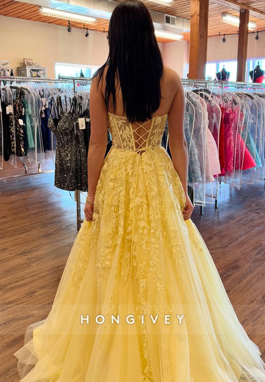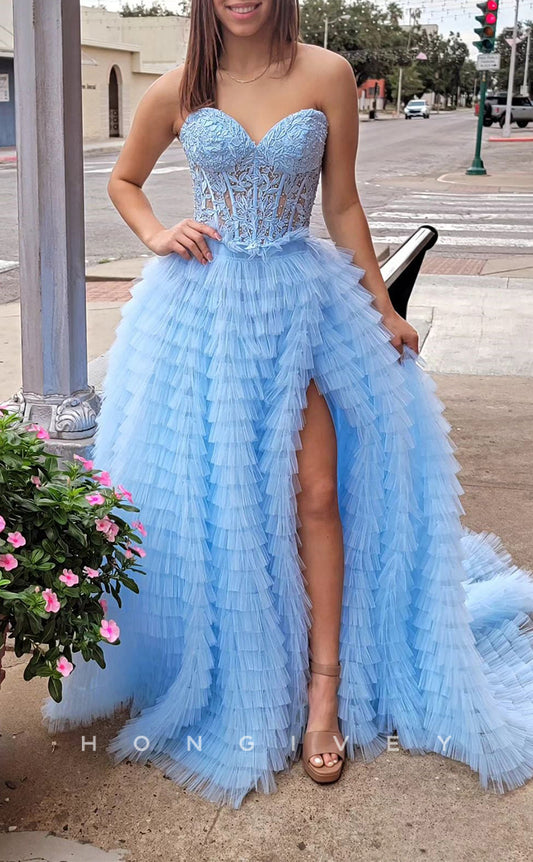 L2496 - Sexy Tulle A-Line Sweetheart Strapless Illusion Empire Appliques With Side Slit Party Prom Evening Dress