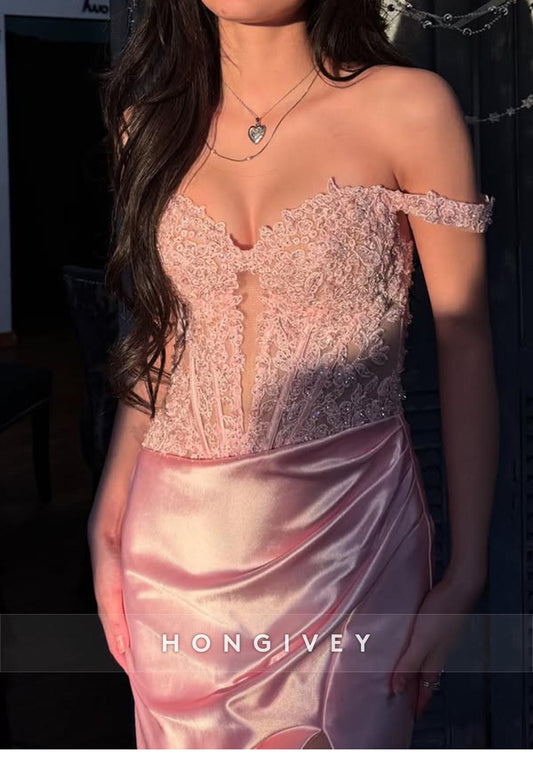 Pink Lace Applique Off-Shoulder Prom Dresses with Split
