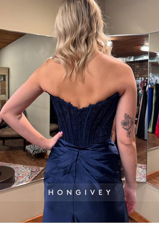L1322 - Sexy Lace Illusion Strapless Sweetheart Strapless With Side Slit Party Prom Evening Dress
