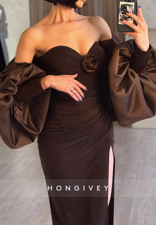 Puff Sleeves Strapless Sweetheart Sheath with Slit Evening Dress Formal Gown