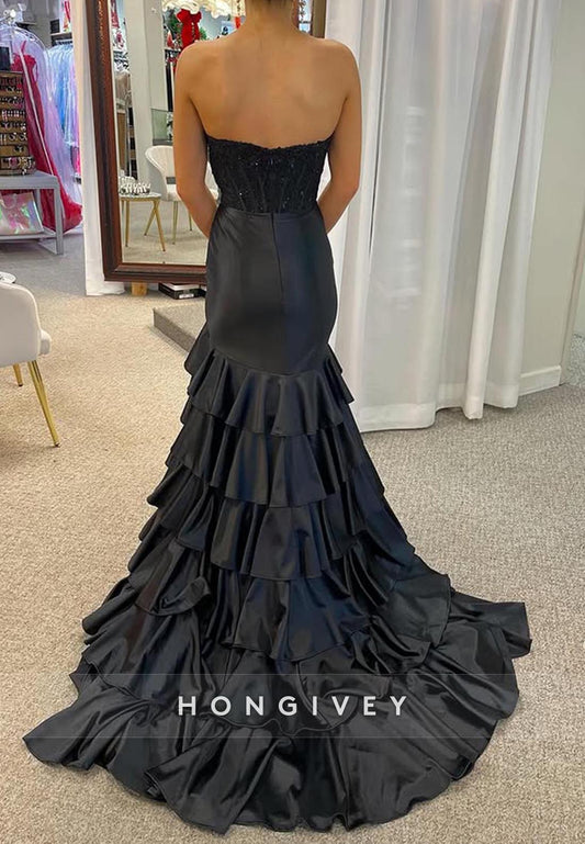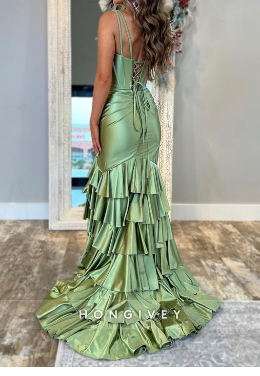 V-Neck Mermaid Tiered Split Prom Dresses with Train