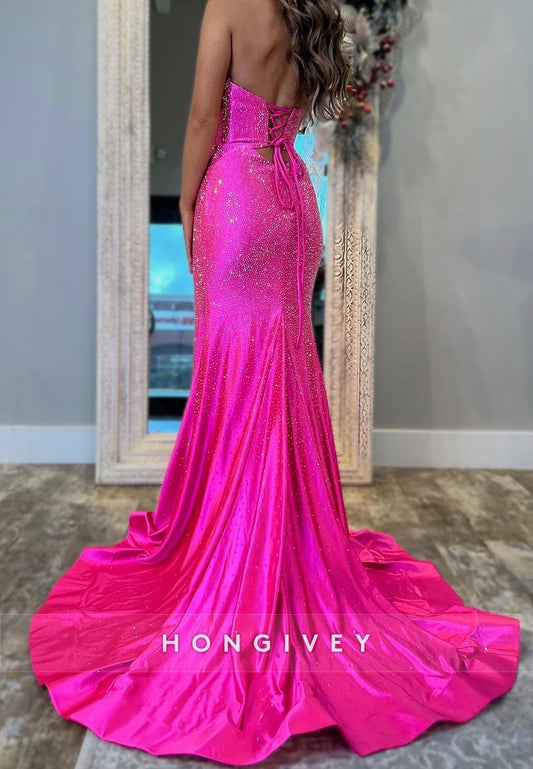 Sexy Satin Fitted Glitter Sweetheart Strapless Empire Fully Sequined Beaded With Side Slit Party Prom Evening Dress