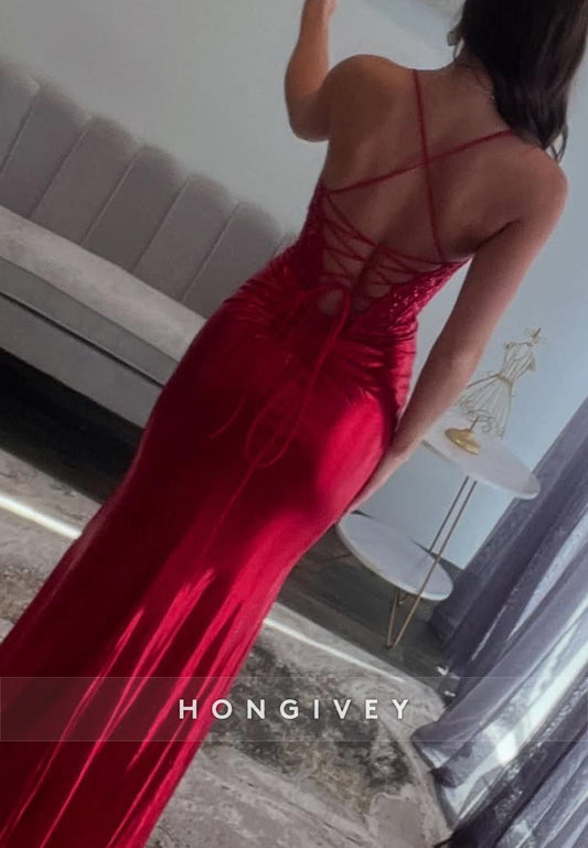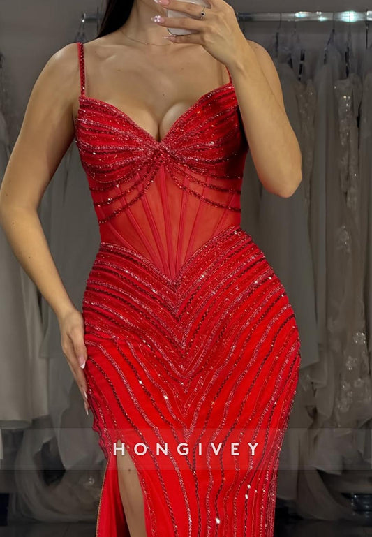 Spaghetti Straps Sexy and Sleek Red Mermaid Long Prom Dresses with Split