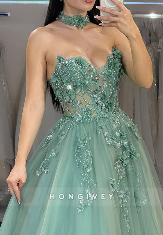 A-Line Sweetheart Lace Applique Rhinestone Long Prom Dresses