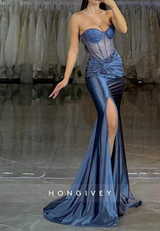 Sequins Strapless Pleats Mermaid Prom Dresses with Split