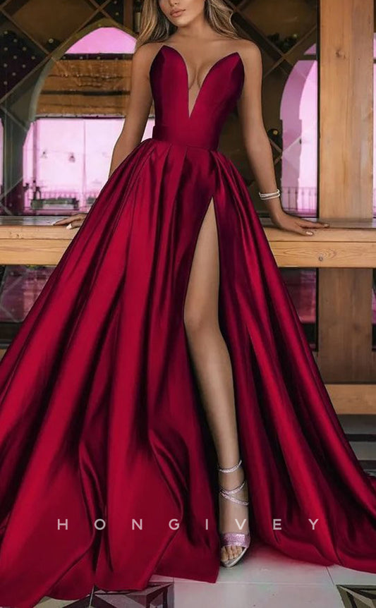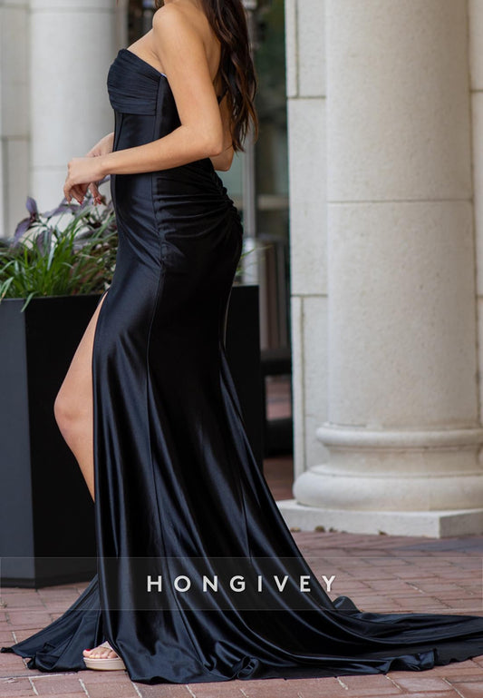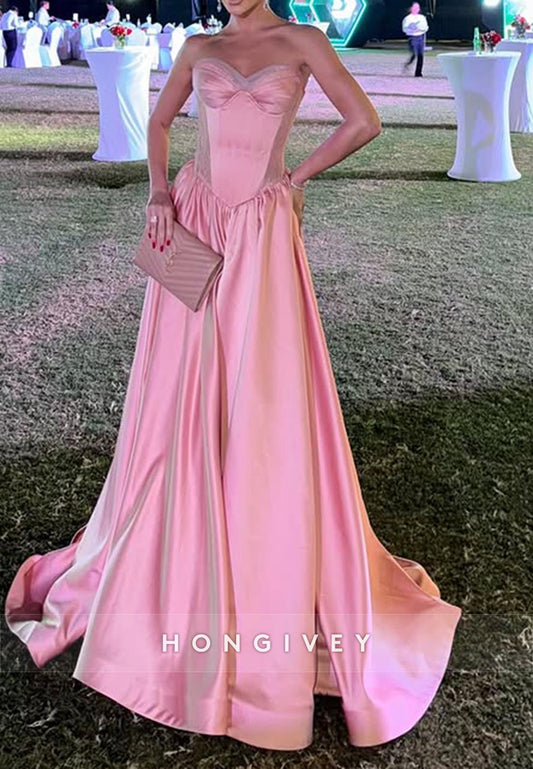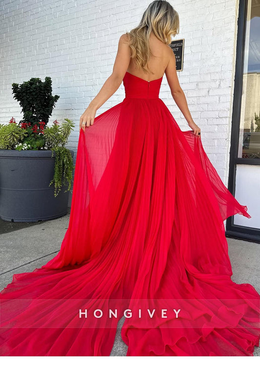 Sweetheart Pleats Split Sleek Prom Party Dress with Sweep Train