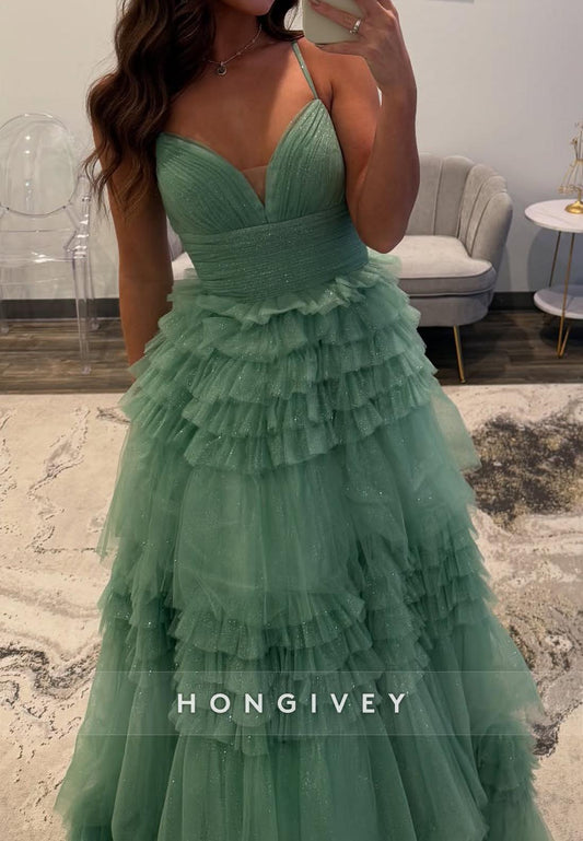 Spakle Bateau Tulle Tiered Ruffles Sequined A-Line Evening Prom Dress Ball Gown