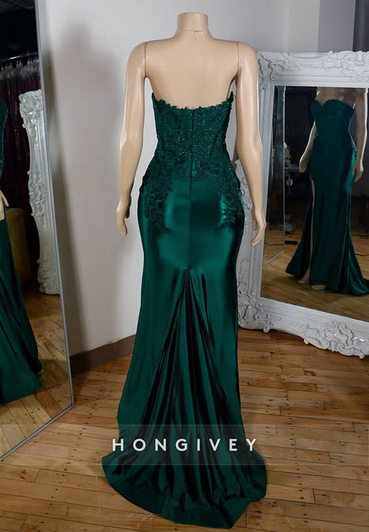 Applique Dark Green Satin Mermaid with Slit Evening Dress Formal Prom Gown