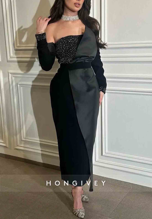 Black Strapless Sweetheart Floor-Length Trumpet Evening Gowns with Sleeves