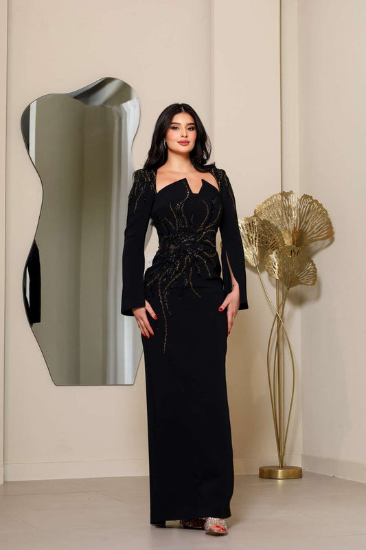 Black Square Neck Beaded Sequins Sparkle Long Sleeve A-Line Evening Dress