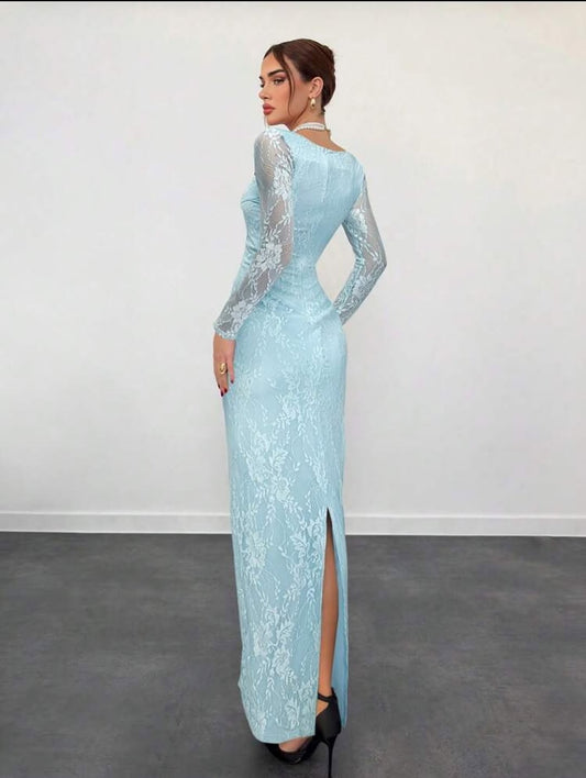 Blue Lace Square Neck Long Sleeve Mermaid Slit Evening Dress Floor-Length