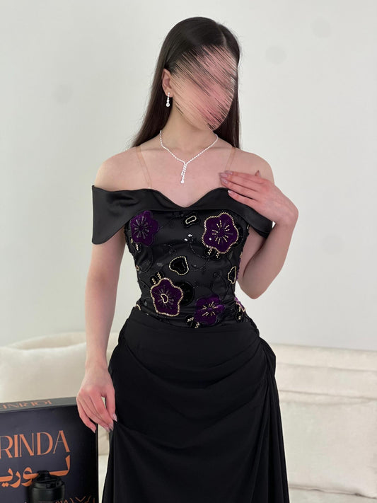 Tulle Black Off the Shoulder Mermaid Flowers Appliques Sequins Gloves Evening Dress
