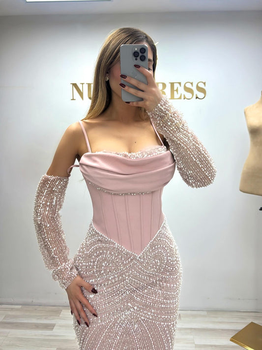 Pink Beaded Sparkle Square Neck 3/4 Sleeve A-Line Evening Dress Foraml Women