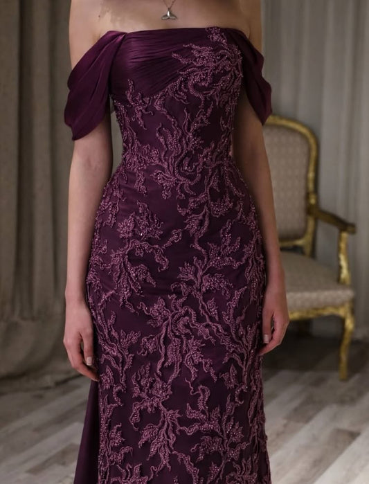Beaded Sequins Lace Off the Shoulder Long Sleeve Mermiad Evening Dress Court Train