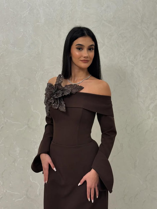 Off the Shoudlder Sequins Flowers Long Sleeve A-Line Evening Dress