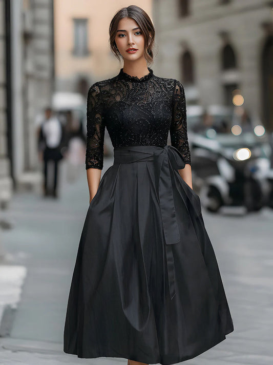 Elegant Black Lace Bodice Dress With Pleated Skirt