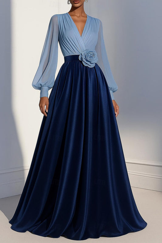 V-Neck Long Sleeve Flowers A-Line Floor-Length Evening Dress