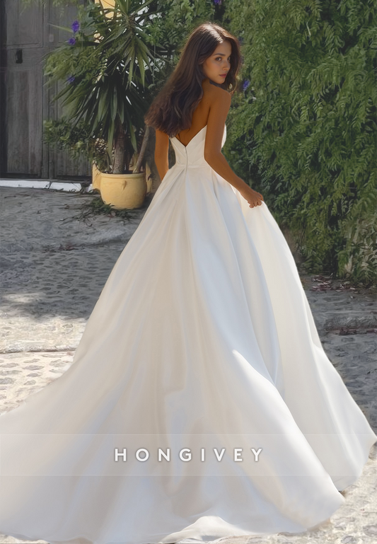 Sexy Strapless Sheer with Side Slit Satin A-Line Wedding Dress HONGIVEY