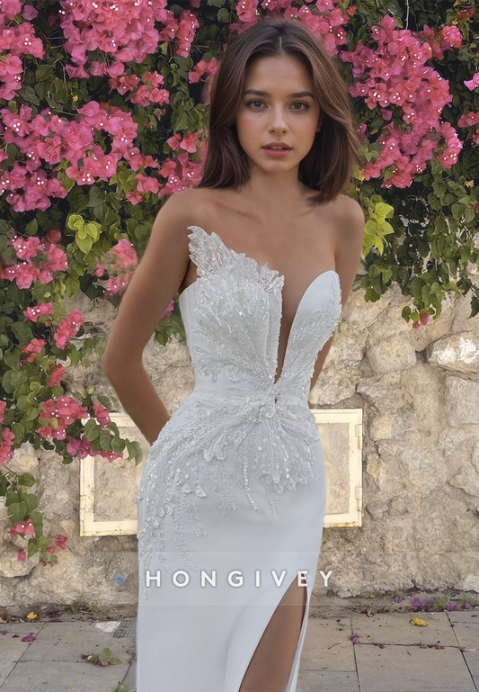 Sexy Strapless Fitted Empire with Slit Lace Applique Wedding Dress Bride Gown