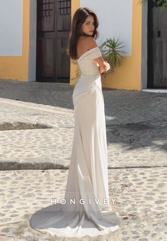 Sexy Glitter Off-Shoulder with Side Slit Ruched Engagement Wedding Dress HONGIVEY