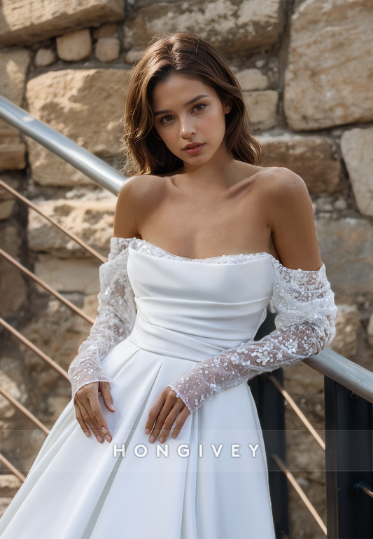 Chic Off-Shoulder A-Line Satin with Train Wedding Dress Bride Gown