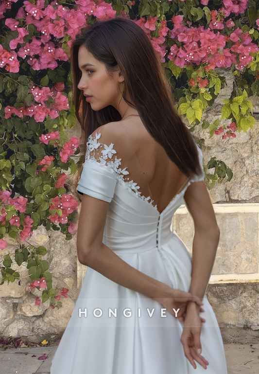 New Floral Short Sleeves Satin Wedding Dress Applique Off-Shoulder Bride Gown