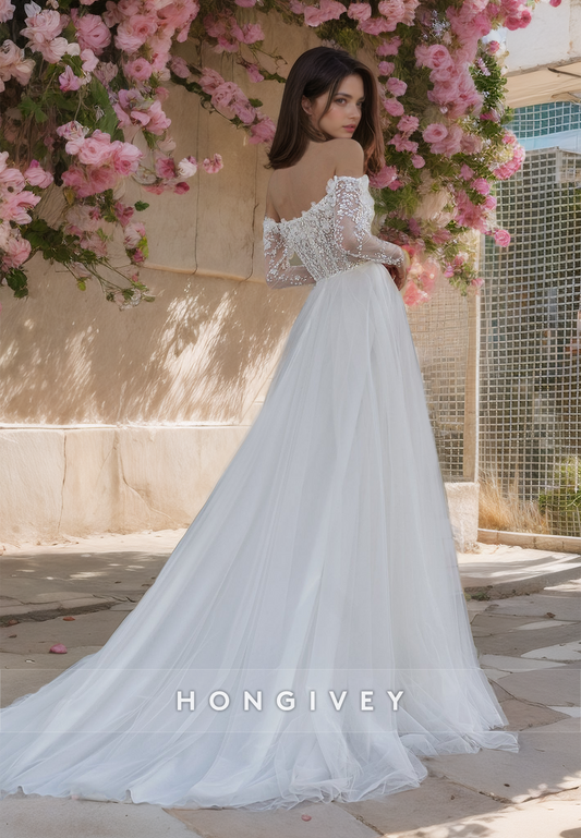 Chic Off-Shoulder Sleeves Applique with Train Tulle Wedding Dress