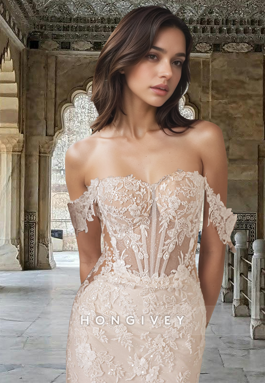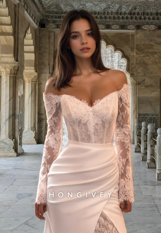 Lace Applique with Train Mermaid Wedding Dress Off-Shoulder Sleeves Bride Gown