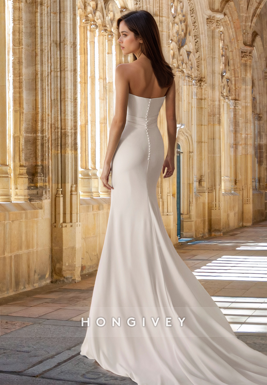 Sexy Strapless Trumpet Ruched with Side Slit Satin Wedding Dress Gown HONGIVEY