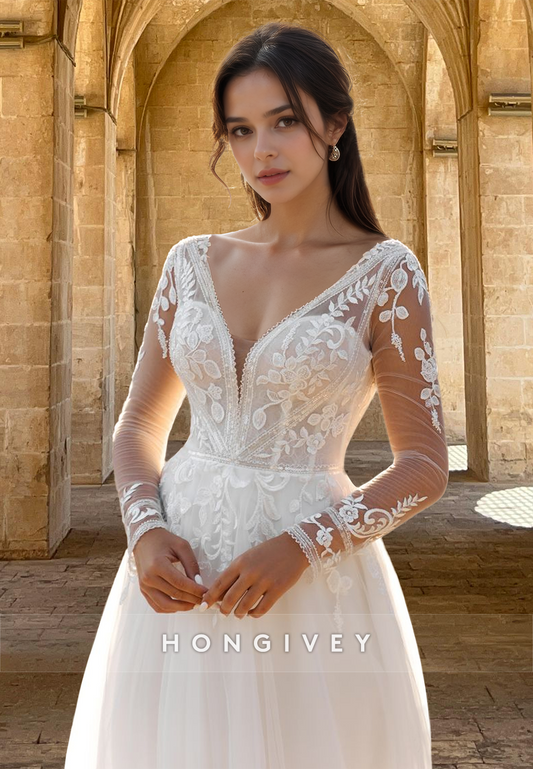 Long Sleeves V-Neck Floral Applique Tulle Wedding Dress 2025 HONGIVEY