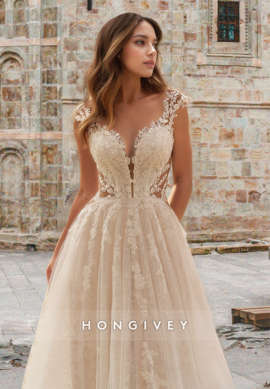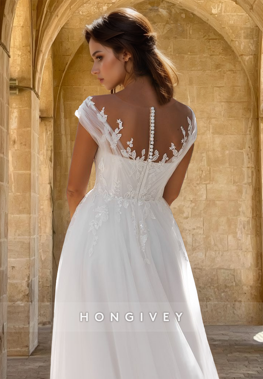 Sexy Sheer Applique V-Neck A-Line Tulle Wedding Dress Bridal Gown