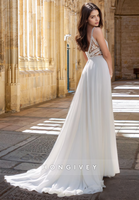 Sexy Tulle V-Neck A-Line with Slit Beach Wedding Dress Bridal Gown