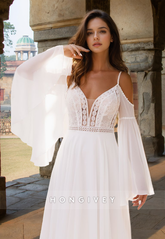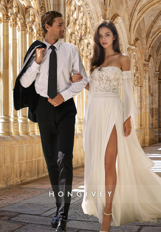 Sexy Sheer Slit Sleeves Lace Applique with Train Wedding Dress HONGIVEY