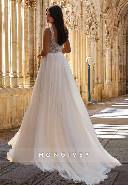 Sexy V-Neck Applique A-Line Tulle with Train Wedding Dress HONGIVEY