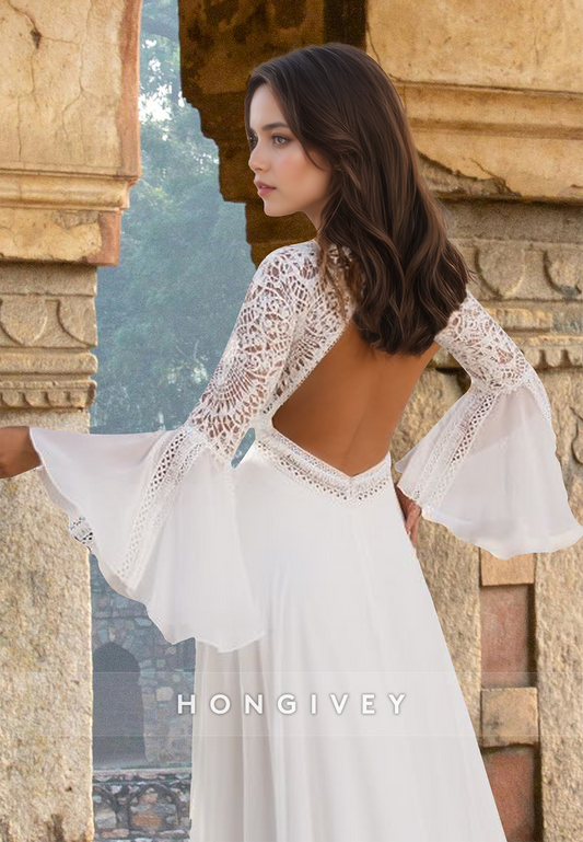 Backless Lace Applique Long Sleeves A-Line Wedding Dress Bridal Gown