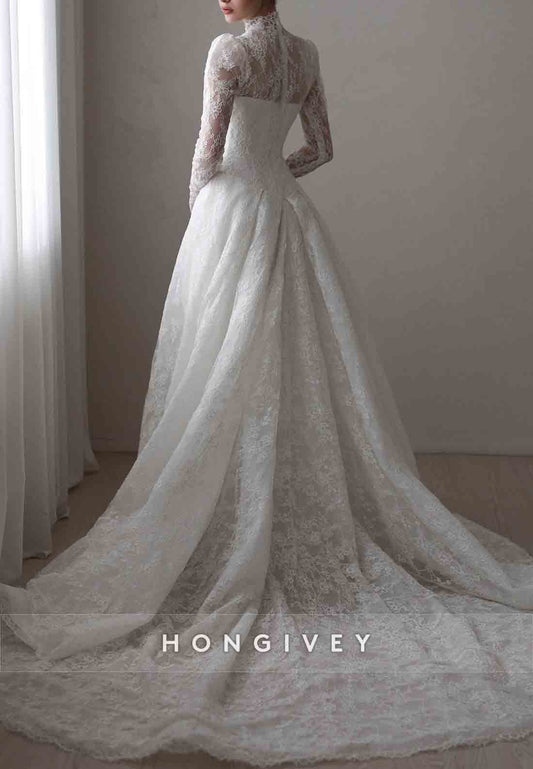 High Neck Lace A-Line Illusion Neck Court Train Long Sleeves Wedding Dresses