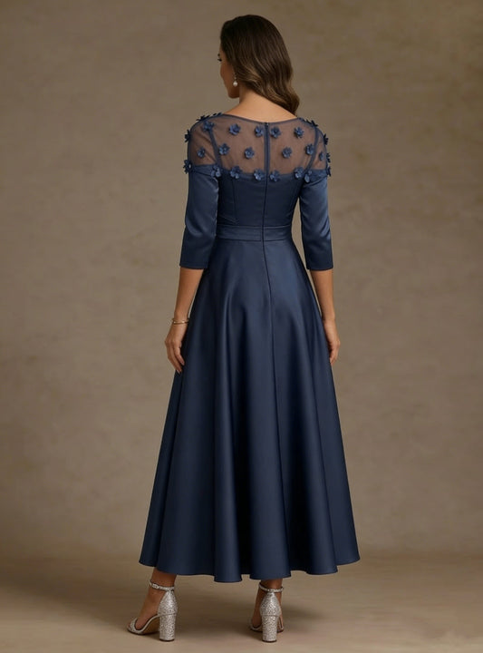V-Neck Acetate Satin Mother of the Bride Dresses 3/4 Sleeves Floral Tea-Length 3D Flower