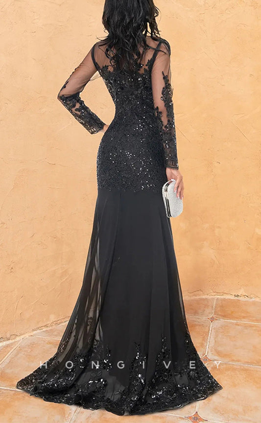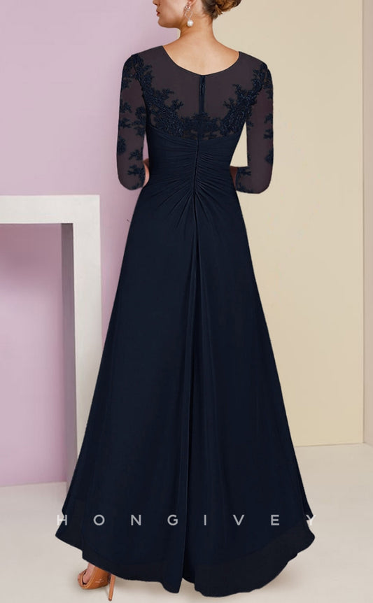 HM185 - A-Line Round Long Sleeve Lace Applique With Side Slit Mother of the Bride Dress