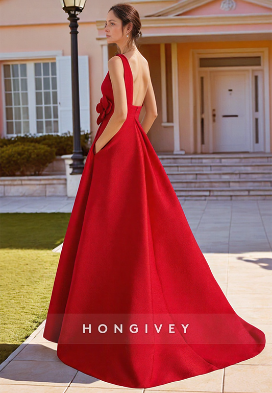 A LineBateau Flower Side Slit Red Mother of the Bride Dress with Pockets