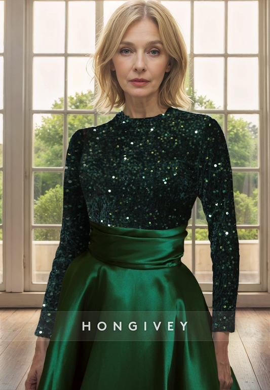 Glitter A-Line High Neck Long Sleeve With Pockets Mother of the Bride Dress