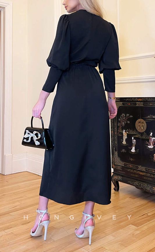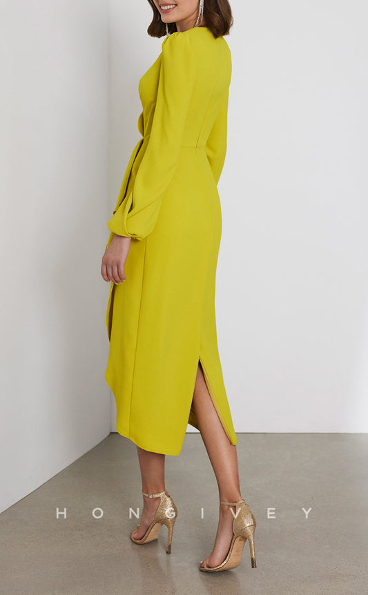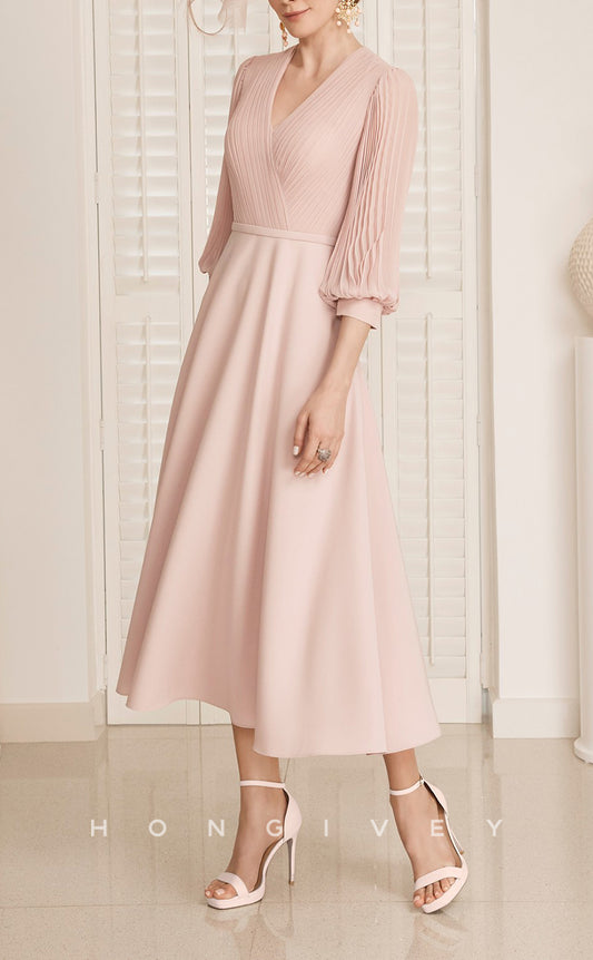 HM270 - Casual Fitted V-Neck Long Sleeve Pleats Tea-Length Cocktail Dress