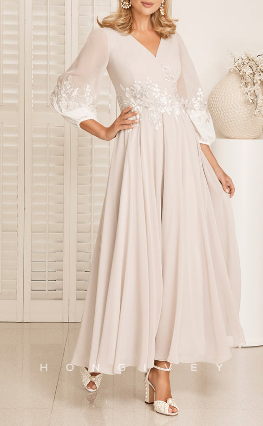 HM161 - Sexy Satin A-Line V-Neck Empire 3/4 Sleeves Appliques Mother of the Bride Dress
