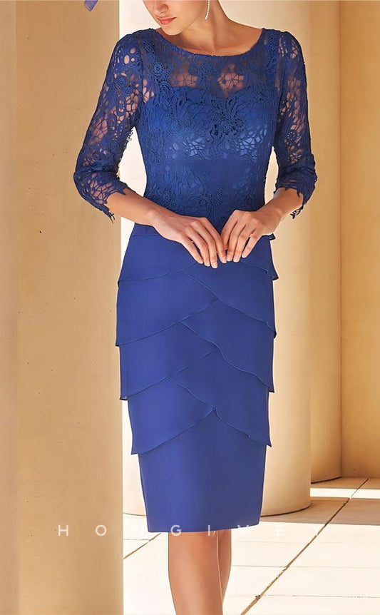 HM199 - Round Fitted 3/4 Sleeves Lace Applique Tiered Knee-Length Mother of the Bride Dress