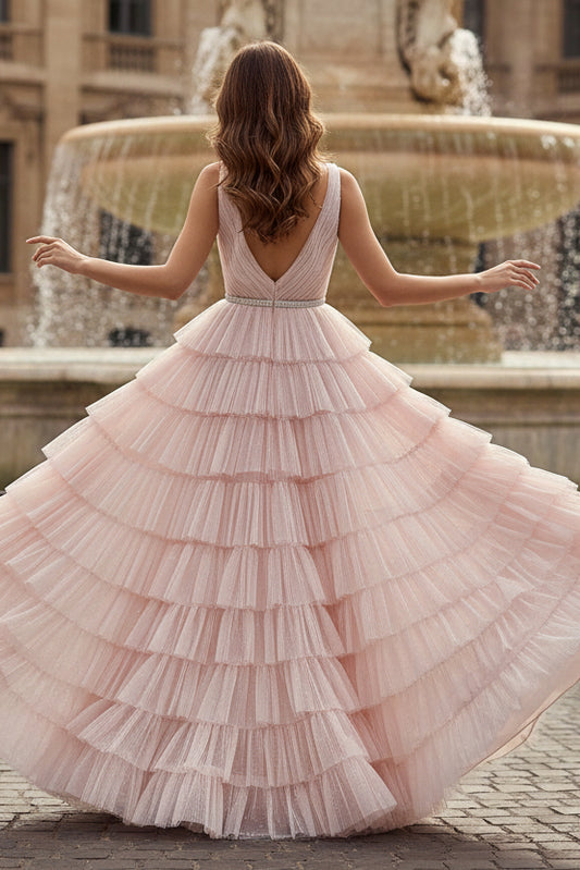 Blush V-Neck Regular Straps A-Line V Back Prom Dresses with Ruffles